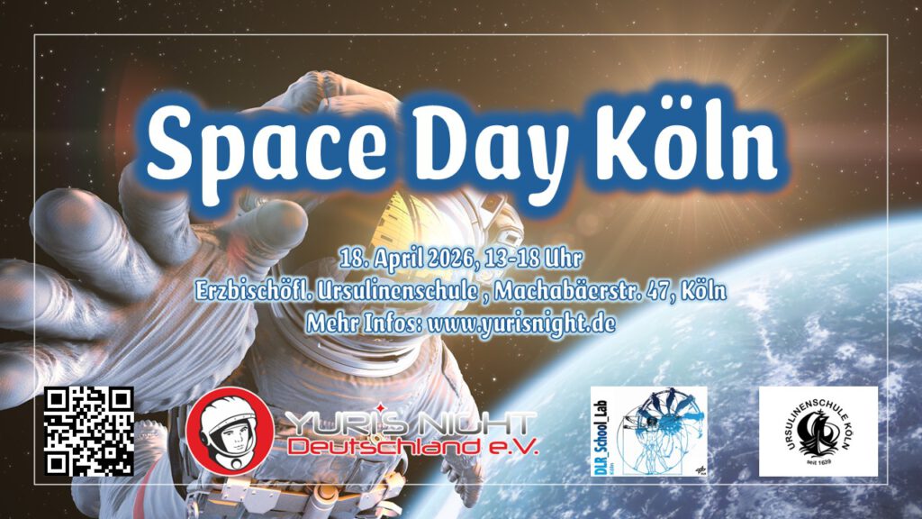 Direkt nach den Osterferien warten direkt zwei Highlights auf euch: Es werden neue Workshops im UrsuLabor ausgeschrieben und am Samstag, 18.04.26 veranstalten wir zusammen mit dem Verein Yuri’s Night Deutschland e.V. und dem DLR_School_Lab den SpaceDay 2026 in Köln: